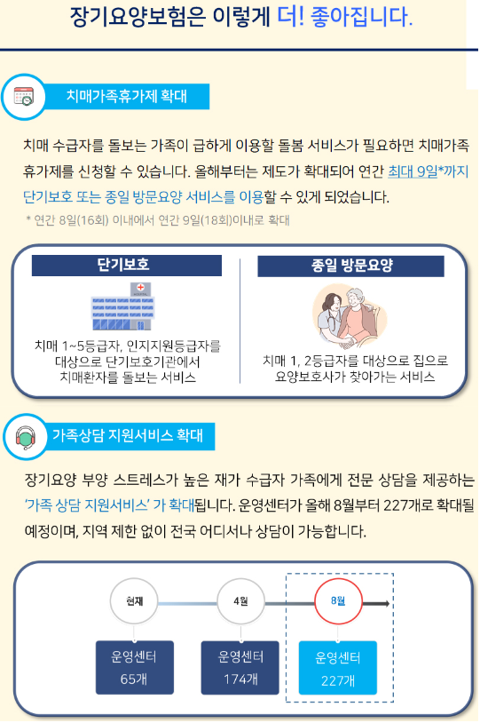 - 장기 요양보험은 노인과 장애인의 장기 요양비를 보장, 가정간호, 호스피스 간호, 시설간호 등이 포함
