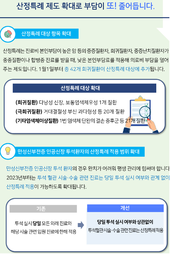 - 진료비 부담이 높은 암 등의 중증질환자 등이 진료를 받을 때, 낮은 본인부담료를 적용해 의료비 부담을 덜어주는 제도