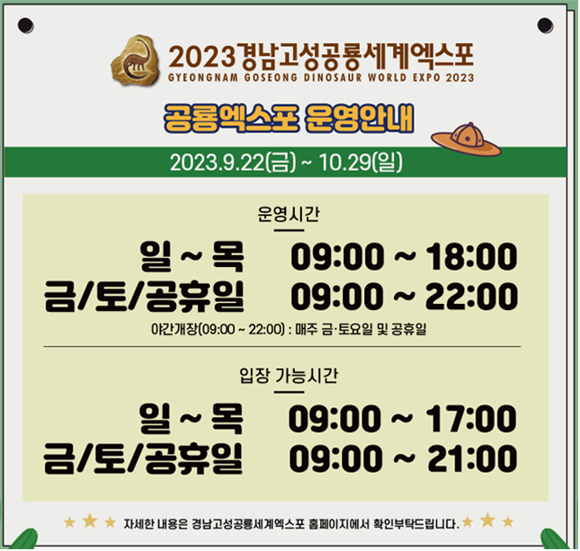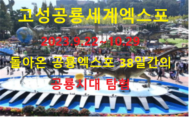 공룡 나라 고성에서 '2023 경남 고성공룡세계엑스포'가 2023년 9월 22일부터 10월 29일까지 당항포관광지에서 개최됩니다. 축제 기간 휴무는 없으며, 매주 금요일과 토요일은 오후 10시까지 야간 개장이 진행됩니다.