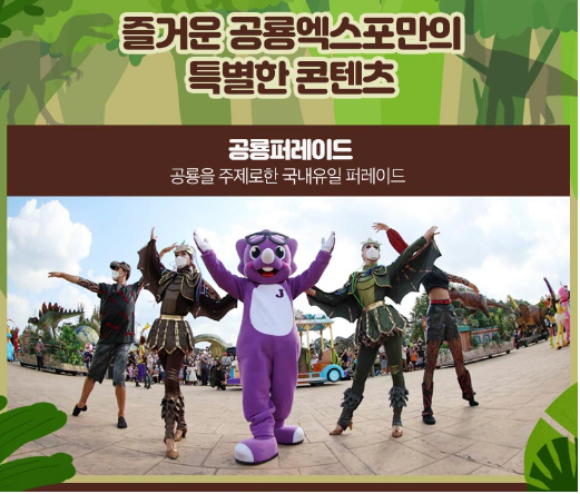 - 공룡 퍼레이드(평시 11시, 16시 / 금, 토 야간 개장 시 주간 2회+1회)