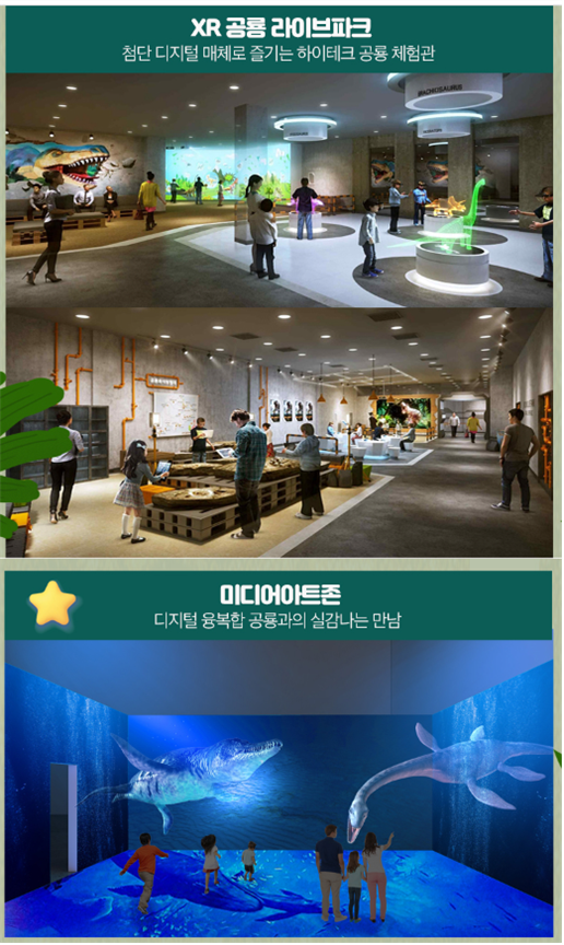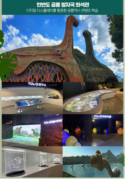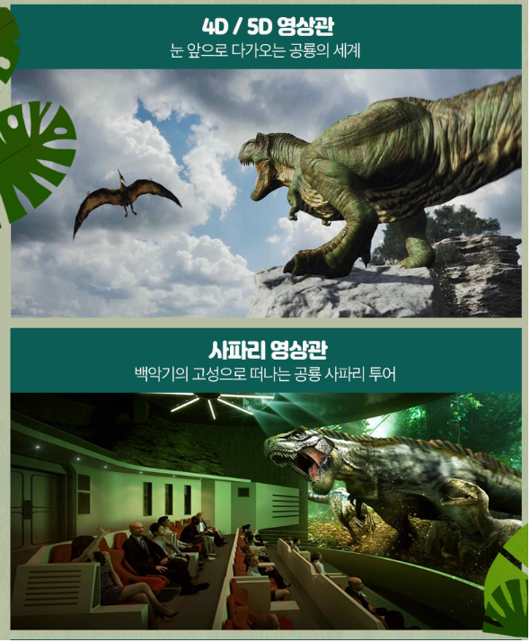 - 주요 시설로 공룡의 역사를 살펴볼 수 있는 주제관과 5D 영상으로, 공룡 생태체험이 가능한 한반도 공룡 발자국 화석관, 공룡 캐릭터관, 식물원 등