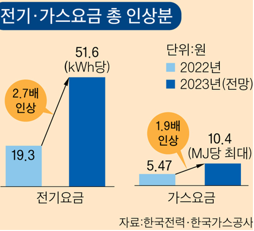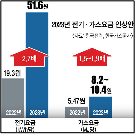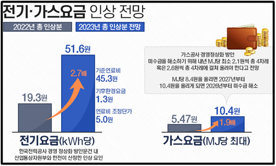- 2023년 1분기에는 기본요금과 기후환경 요금이 인상, 1970~1980년대의 오일쇼크 이후로 큰 인상 폭