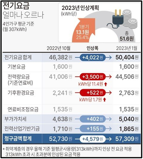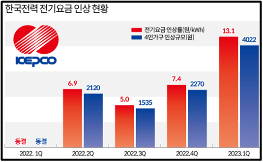 - 2023년 1분기 전기 요금은 kwh 당 13.1원 인상(약 9.5% 인상), 이는 4인 가구 월평균 전기 요금이 약 4천 원 인상될 수 있는 수준