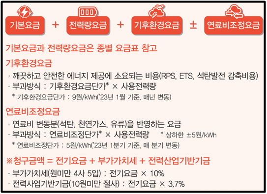 - 단순 기본요금뿐만 아니라 전력량, 기후환경, 연료비 조정 등의 전반적인 요금을 포함해 전기 요금으로 청구하는 시스템