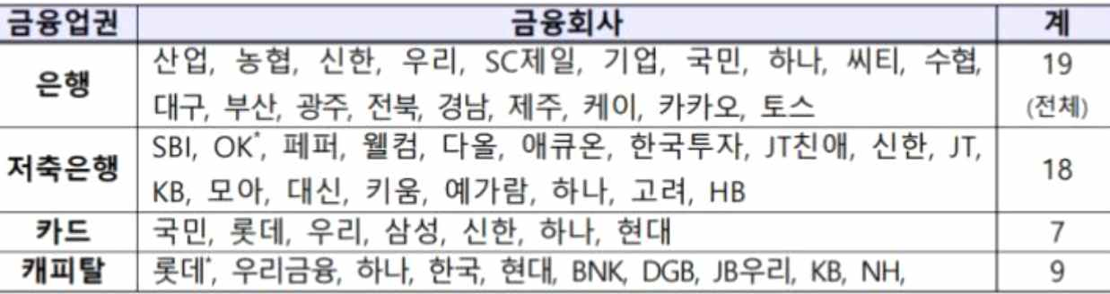 - 사실상 주담대와 전세대출을 취급하는 주요 은행사, 보험사, 대형 캐피털사 등이 모두 참여