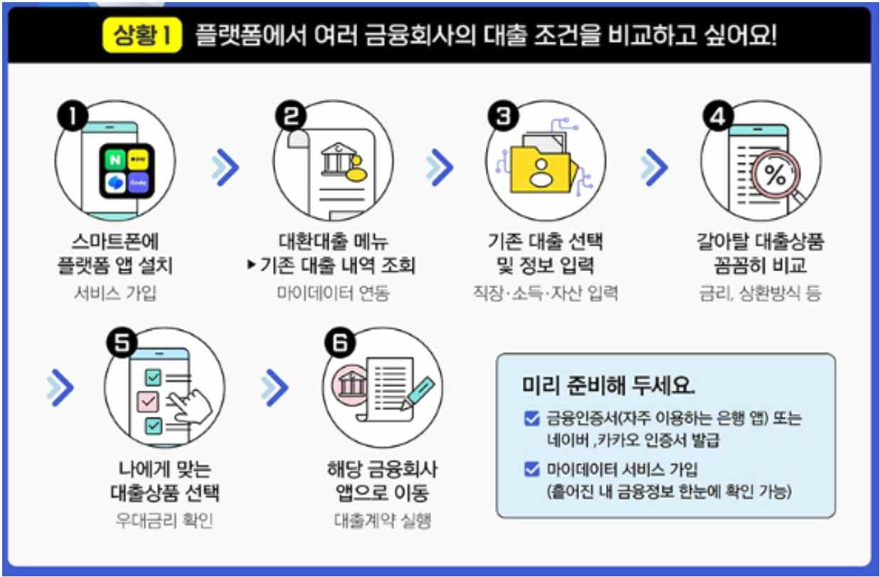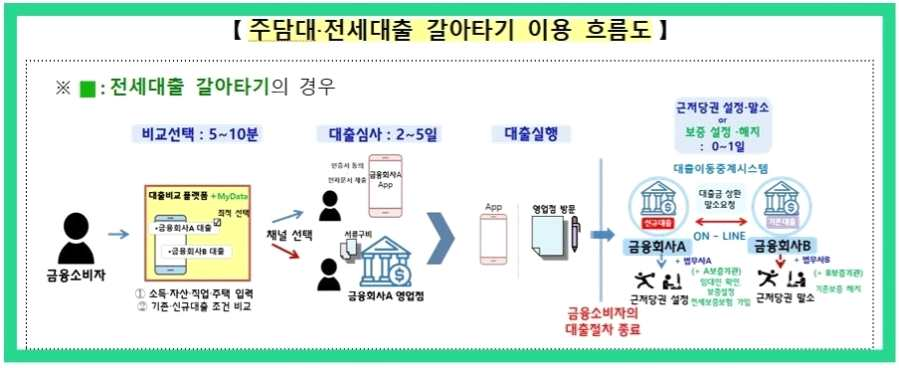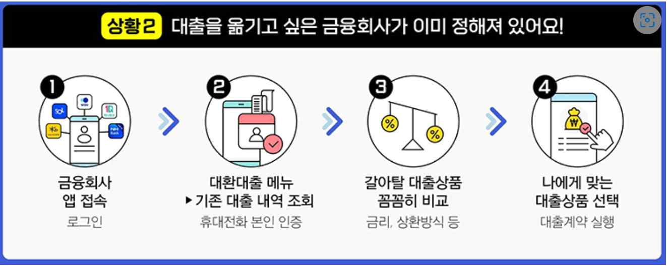 - 또한 현재 대출을 갈아타려면, 기존 금융회사에서 새로 대출받는 금융회사에 상환에 필요한 정보들을 소비자가 직접 전달해야 함