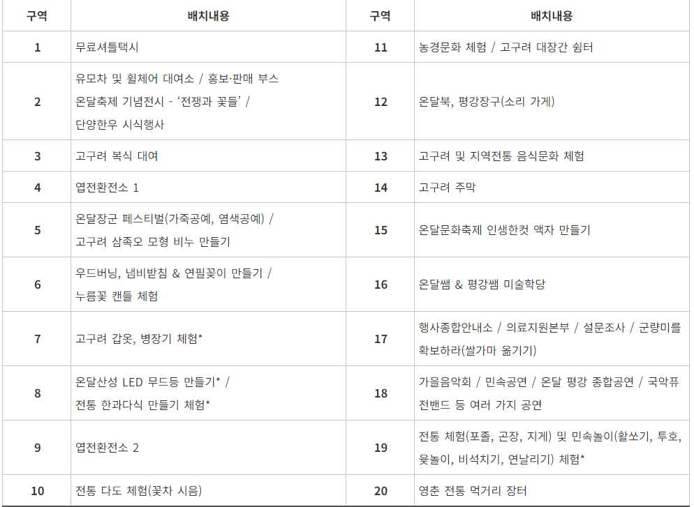 - 온달관광지 : 가을 음악회, 소공연 및 버스킹 공연, 단위행사 체험부스 운영, 전통 플리마켓, 홍보. 판매 행사
