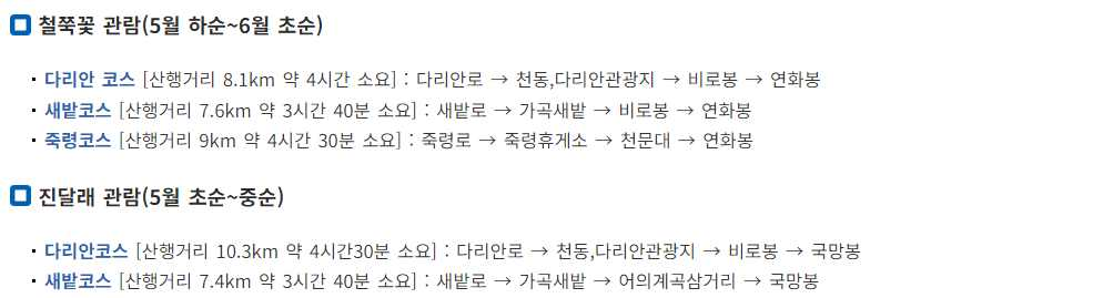 - 철쭉꽃 관람 : 5월 하순~6월 초순, 진달래 관람 : 5월 초순~중순