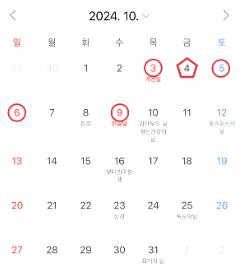 - 10월에는 개천절(10.3)이 목요일이라, 금요일 하루 연차를 사용 시 10.3~10.6일까지, 4일간 연휴 확보 가능
