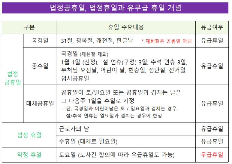 - 52일의 일요일과 국경일. 설날 등 18일의 공휴일을 더해 70일이 되나, 설날(2.11.)과 어린이날(5.5.)이 일요일과 겹쳐 실질적 총공휴일 수는 68일