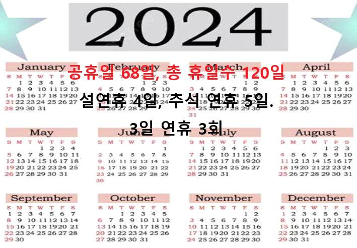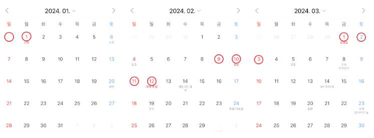 - 2024년 신정 : 신정(1.1)이 월요일이라 12.30~2024.1.1일까지, 3일간 연휴 확보