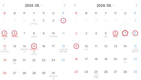 - 6월 현충일(6.5)이 목요일이라 금요일 하루 연차를 사용하면 6.6~6.9일까지, 4일간 연휴 확보 가능