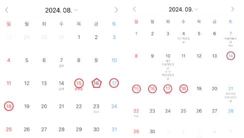 - 9월에는 추석 연휴가 있는데, 9.14일부터 9.18일까지, 5일간 연휴 확보