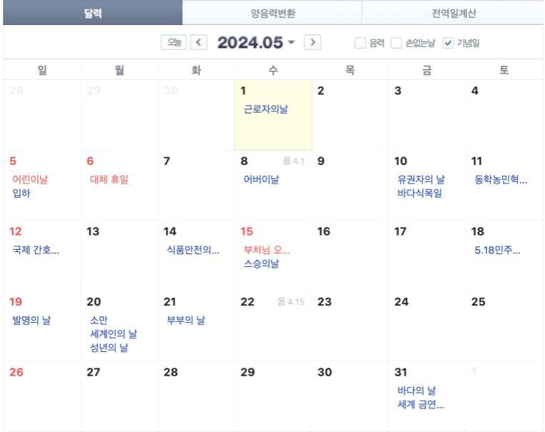 - 5월 어린이날(5.5)은 일요일이라 6일 월요일이 대체 휴일이 되어 5.4~5.6일까지, 3일간 연휴 확보