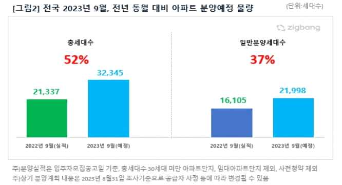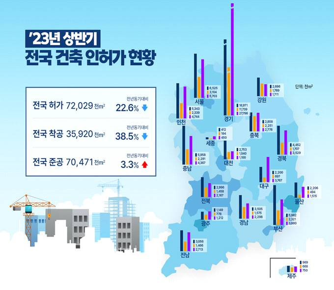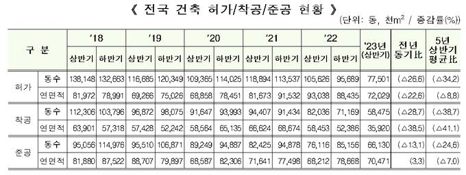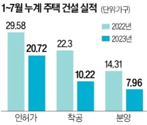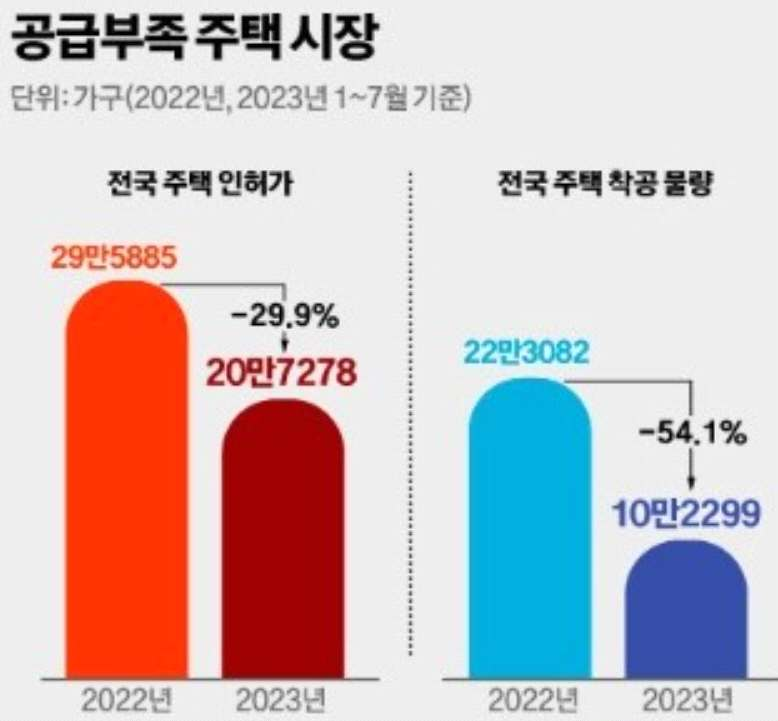 - 2023년 1~8월 전국 주택 인허가 38.8%, 착공 물량 56.9%로 2022년 동기 대비 급감