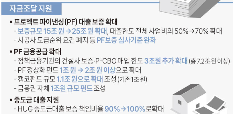- 정부가 나서 공적 보증기관(HUG, 주금공)의 보증 규모를 확대, 심사 기준 등을 대폭 완화해 부동산 PF 시장을 다시 활성화한다는 것