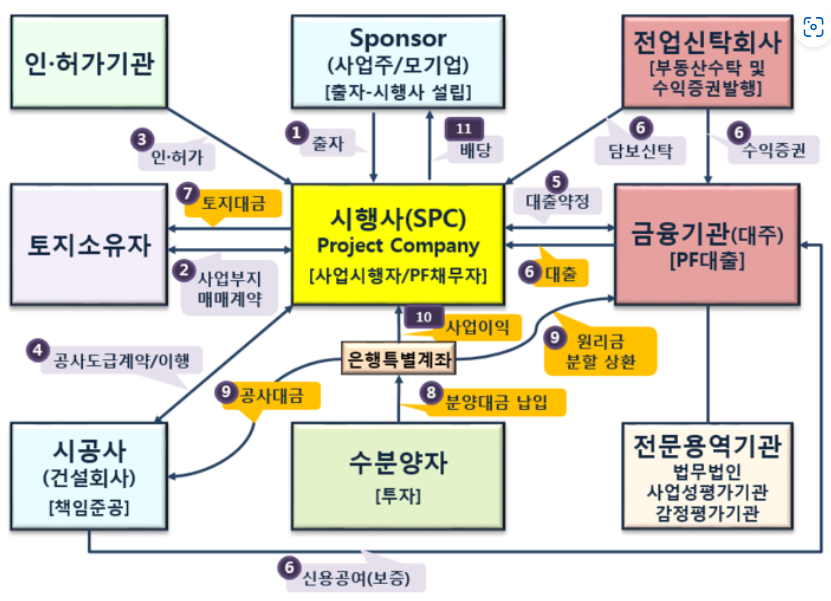 - 자금제공자들은 프로젝트의 현금 조달을 우선 고려해 대출을 결정하고, 프로젝트에 투자한 원금과 수익을 돌려받는 자금 구조, 다시 말해, 특성 사업의 사업성과 장래의 현금흐름을 보고 자금을 지원해 주는 것