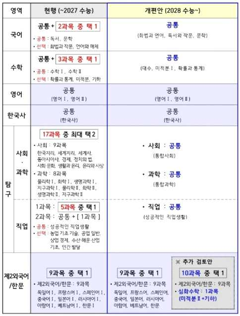 - (현재) 공통+선택과목 체제, 사회 과학탐구와 직업 탐구는 최대 2과목을 선택해 응시