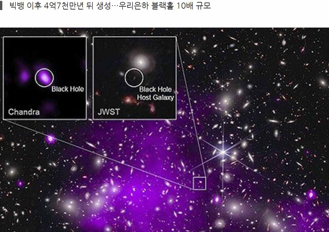 우주가 시작된 대폭발 현상인 빅뱅 이후, 4억 7,000만 년 뒤 만들어진 최고령 블랙홀이 발견됐습니다. 미국 항공우주국(NASA) 제임스웹 우주망원경과 찬드라 X선 관측소가 관측한 것입니다.