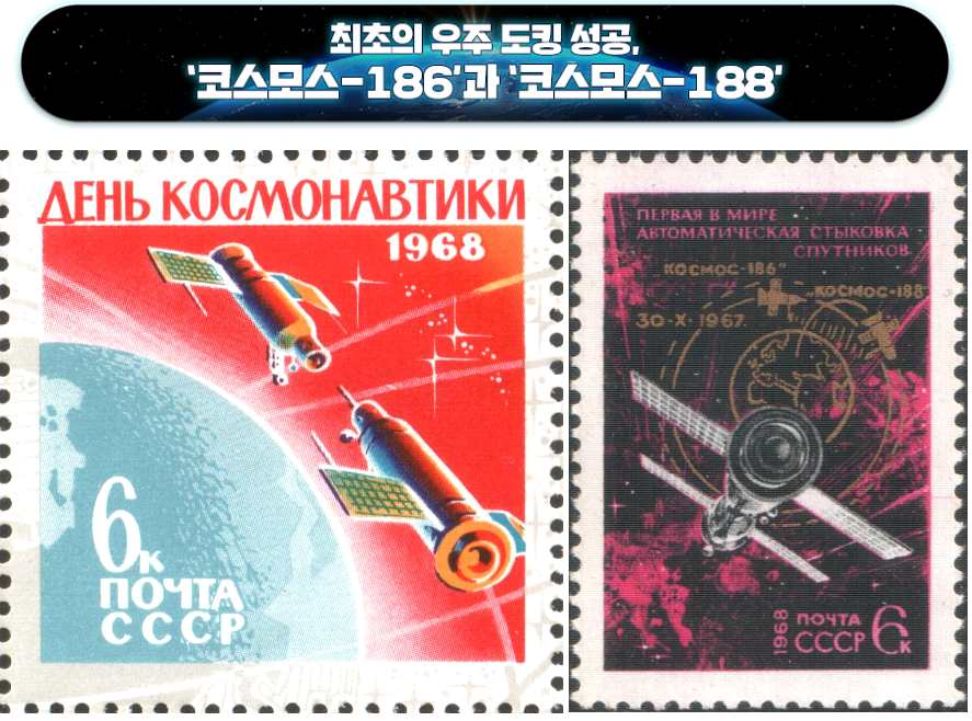 - 1967년 소련은 두 개의 위성인 '코스모스-186'과 '코스모스-188'의 무인 도킹을 성공