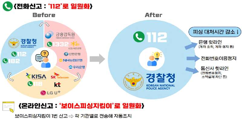 이제는 한 번의 신고로 사건처리부터 피해구제까지 원스톱처리가 진행됩니다. 보이스피싱 피해 신고 창구가 일원화되어 여러 곳에 반복 신고할 필요가 없어져 대응이 보다 신속해질 수 있을 것 같습니다.