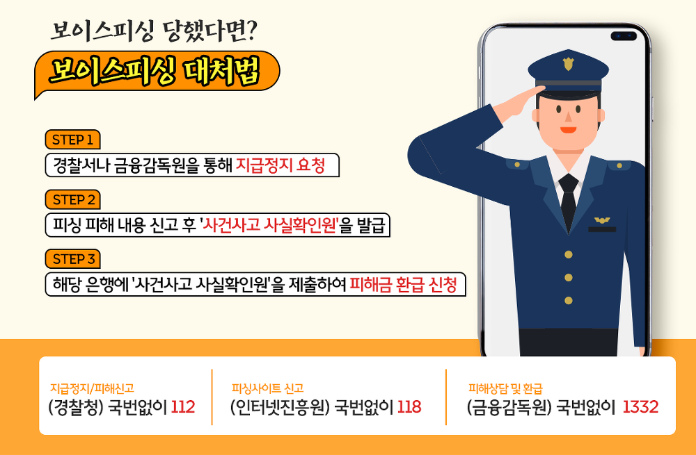 추가로 최근 발표된 보이스피싱 신종수법을 알아두고, 예방부터 대응까지 자세한 정보를 꼭 숙지하시어 피해가 없으시길 바랍니다.