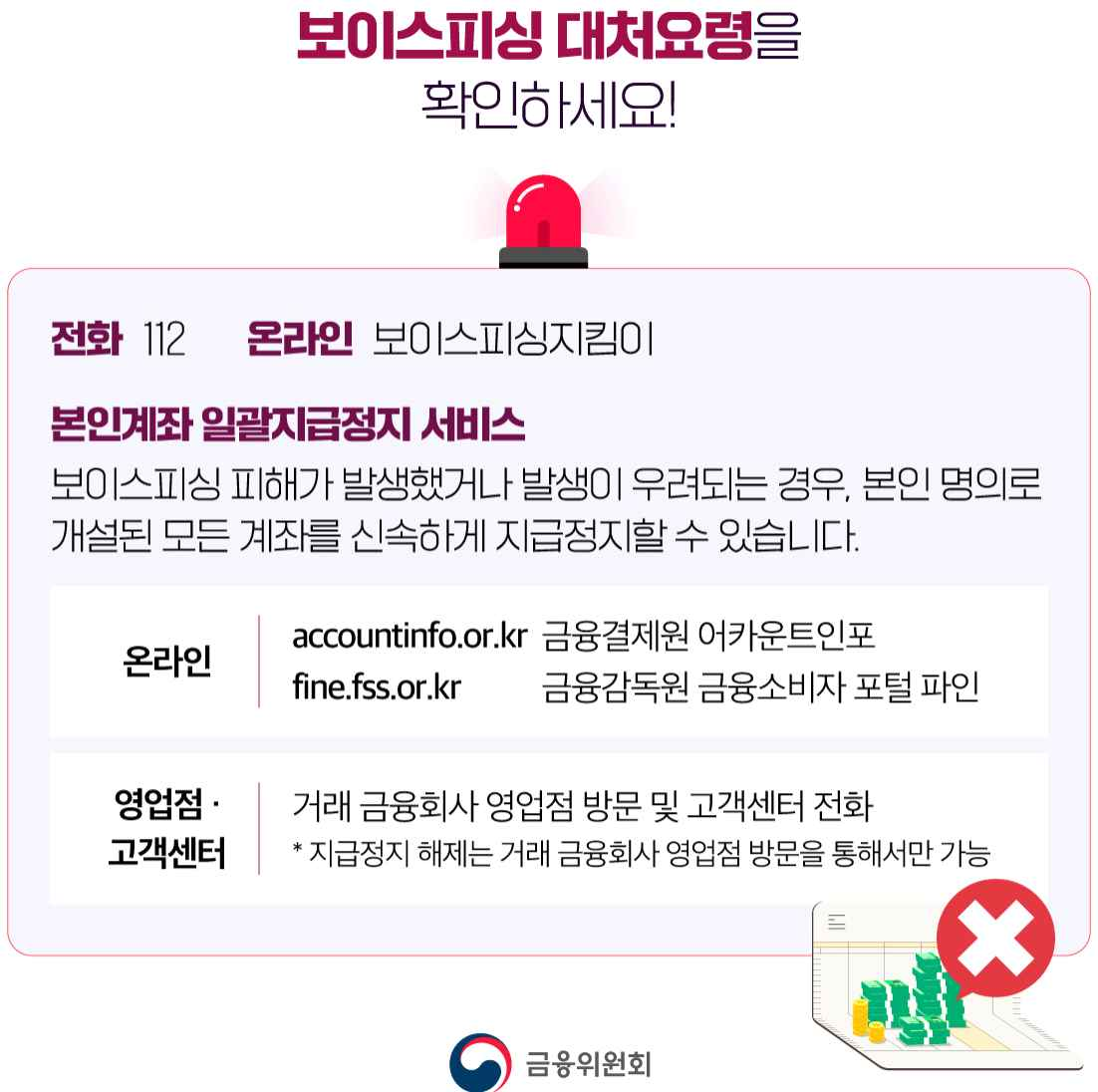 - 보이스피싱 피해가 발생, 발생이 우려되는 경우, 본인 명의로 개설된 모든 계좌를 신속하게 지급정지