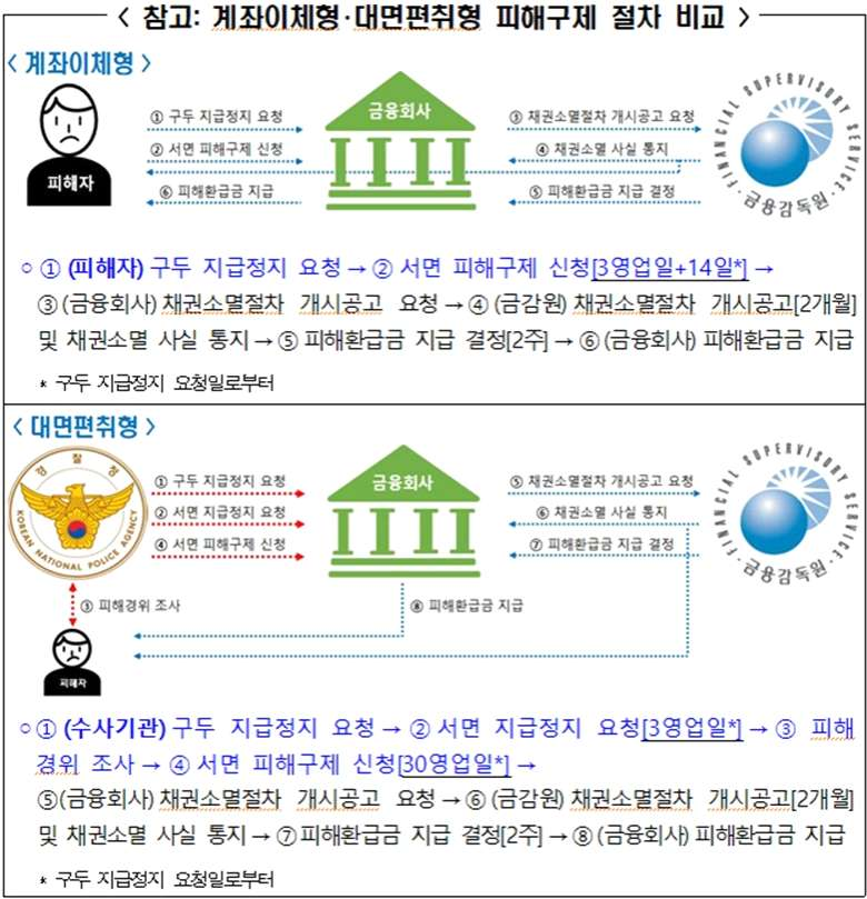 [참고] 계좌이체형 보이스피싱 : 이체나 송금 후 피해자가 신고해 지급정지 가능