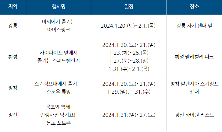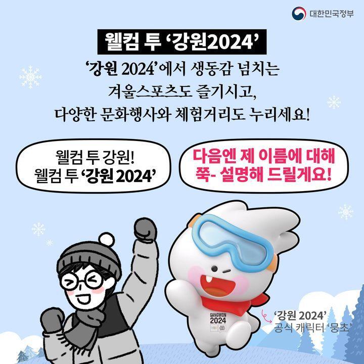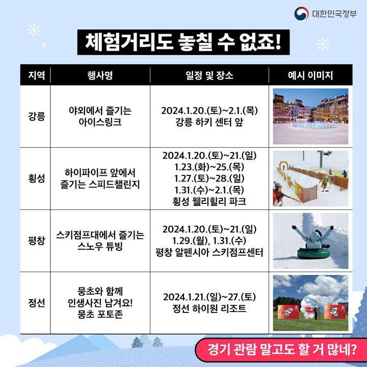 내년 겨울! '강원 2024'에서 생동감 넘치는 겨울스포츠도 즐기고, 다양한 문화행사와 체험 거리도 즐겨보는 건 어떠하신지요?