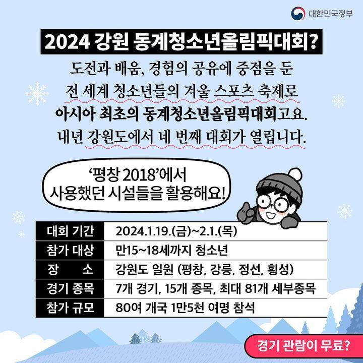 2024년 1월 우리나라에서 국제 청소년 올림픽 대회가 개최된다는 거 아시나요? 바로 '2024 강원 동계 청소년 올림픽 대회'인데, 전 경기 입장권이 무료라 일반인도 경기 관람은 물론 다양한 문화생활과 체험까지 가능하다고 합니다.