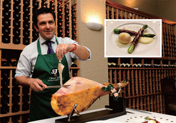 스페인 하몽은 돼지 뒷다리를 통째로 소금에 절인 후 오랜 시간 건조해 만든 생햄인데, 익히지 않았기 때문에 어두운 붉은색입니다.