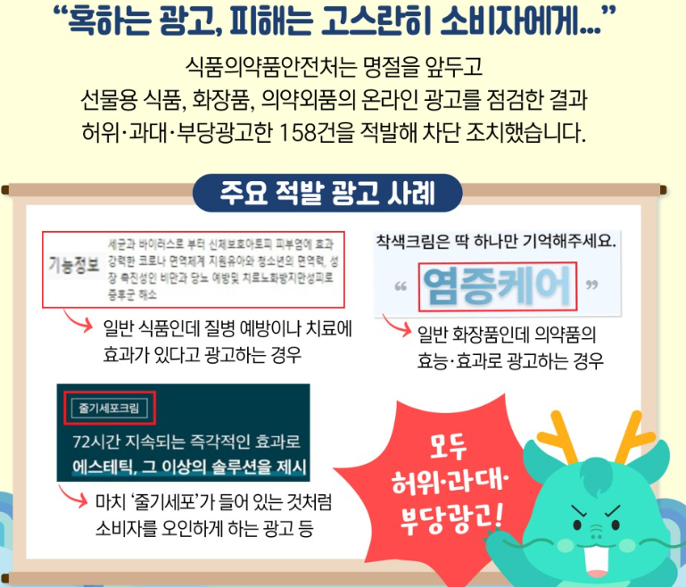 소비자 울리는 허위 · 과대 · 부당 광고 명절 선물 구매 전 주의하셔야 합니다. 식약처는 설을 앞두고 소비자 피해를 예방하기 위해 의약외품의 온라인 광고를 집중 점검을 하였습니다.