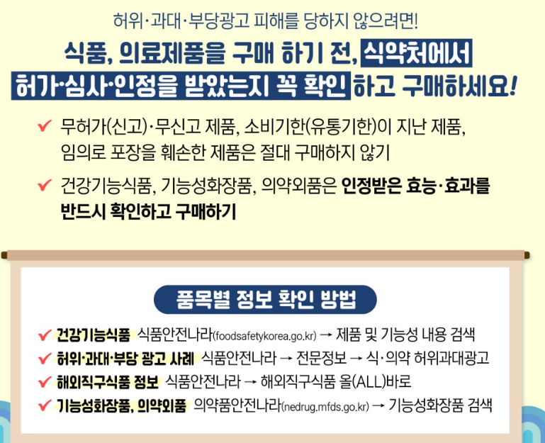 허위 · 과대 · 부당 광고로 인한 피해를 예방하기 위해서, 식품 및 의료제품 등을 온라인에서 구매할 때는 무허가(신고) · 무 표시 제품, 소비기한(유통기한)이 지난 제품, 포장을 임의로 훼손한 제품 등은 절대 구매하지 않아야 합니다.
