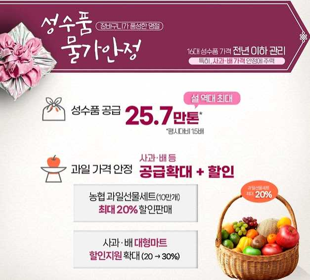 - 과일 가격 안정(사과 · 배 등) 공급 확대 및 할인