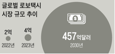 - 시장조사 업체인 마케츠 앤드 마케츠는, 글로벌 로보택시 시장 규모가 올해 4억 달러(약 5,226억 원)에서, 2030년 457억 달러로 급성장할 것으로 전망