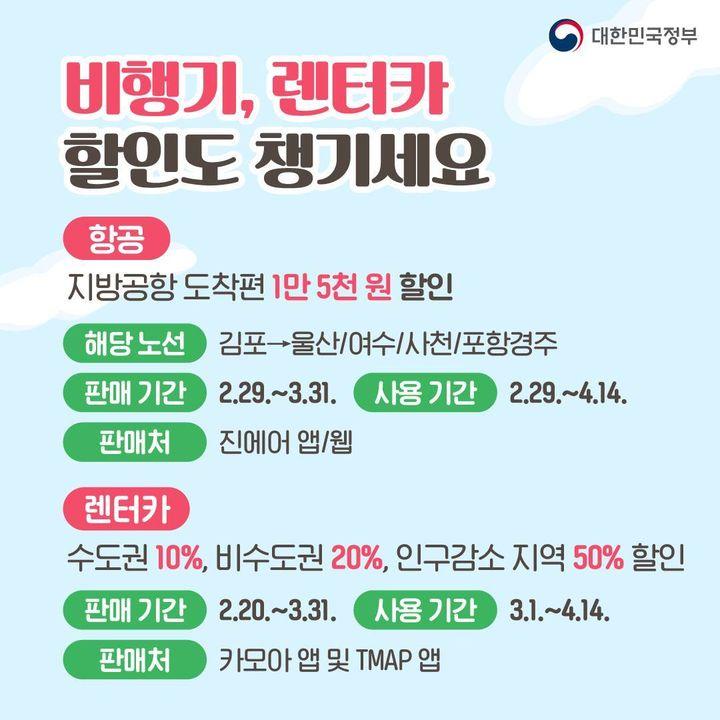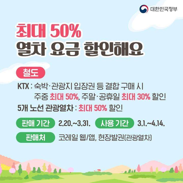 5개 노선 관광열차도 코레일 응용프로그램(앱)·누리집(웹)과 현장 발권을 통해, 최대 50% 할인받아 이용할 수 있고, 국내 4개 노선 지방 도착 항공권, 렌터카도 할인된 요금으로 이용할 수 있습니다.