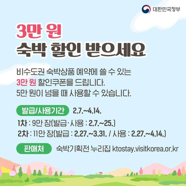 - 비수도권 숙박상품 예약에 쓸 수 있는 3만 원 할인쿠폰 제공(5만 원이 넘을 때 사용 가능)