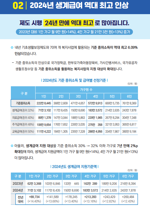 * 생계급여 지원 금액은 역대 최대 수준인 13.16% 인상하여, 4인 가구의 경우 21만 3천 원 증대