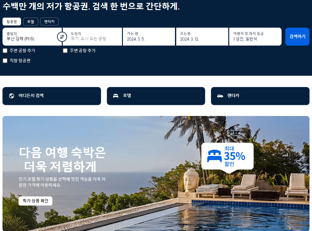2. 특가 및 저가 항공권 검색 : 스카이스캐너를 통해 모든 주요 항공사와 여행사의 저가 항공권을 비교하고, 원하는 목적지로 가는 최저가 비행기 표를 검색